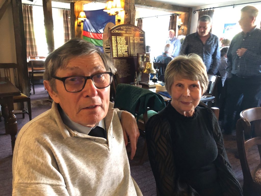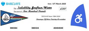 The final action of the Fitting Out Lunch was for Geff to remind the attendees of his choices for the Commodore’s Charity for 2024-2025. It was decided to donate £400, £10 for every year of the 40 years SOCA had been in exsistence. This has been split evenly between the RNLI in recognition of it’s 200 year anniversary. With another £200 being presented to Grafham Water Sailability. Geff presented a cheque to Pauline who is a long time SOCA member and key member of Grafham Water Sailabilty.