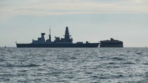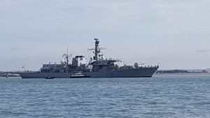 Just before crossing the main channel into Portsmouth, Saluki had to halt to let a Frigate pass ahead.