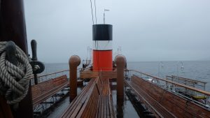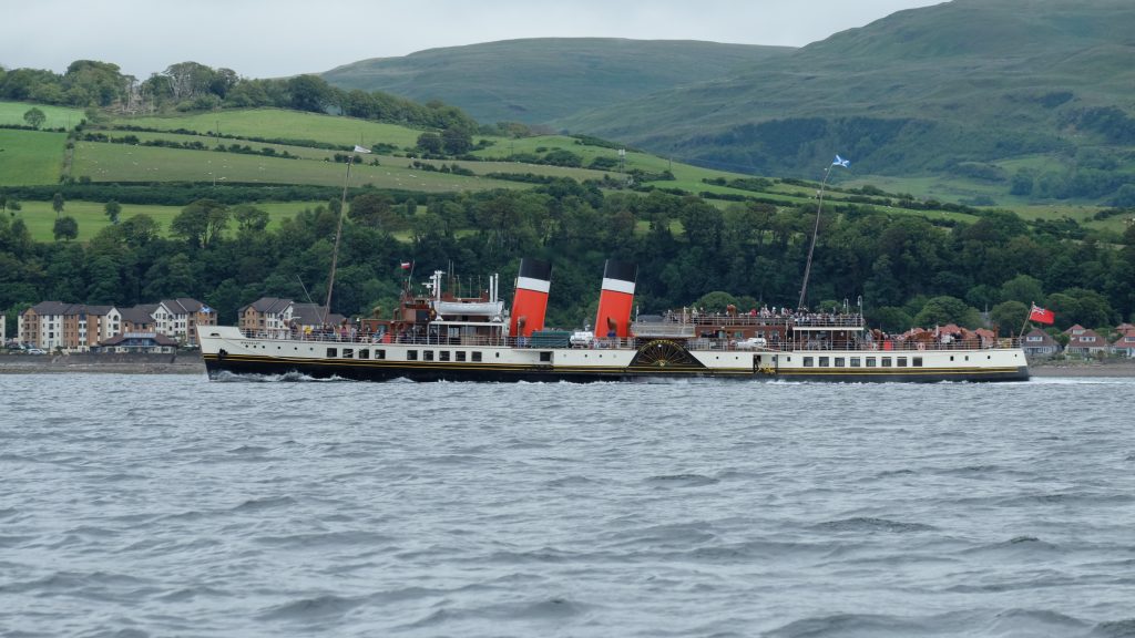 The paddle steamer struggled to Rothesay on the Isle of Bute, where some of the passengers disembarked to visit the town, we continued to the Kyles of Bute but had to turn back before we reached the end due the weather. The return trip then returned to Rothesay to pick up passengers and then onto to Greenock where she berthed with difficulty due to the offshore wind.