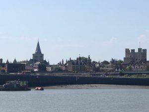 On Monday, We had a lazy morning waiting for the start of the flood tide and went out of the Chatham Marina lock around 10.30AM. There was still very little water in the river which was definitely helpful going under Rochester Bridge (HW air-draft about 8m). We allowed the early flood to carry us up river, occasionally scraping our keels on unknown submerged  items. The scenery was almost entirely man-made but not without interest, including a paddle steamer and ex-russian navy submarine. Most of us gently grounded at times and had to wait 10 mins for the tide to lift us clear. My rudder blade lanyard broke – I had to lift the rudder off from inside the boat (at anchor), repair the lanyard and replace the rudder – all single handed!  -It actually was easier than I’d expected – it only took 15 mins.