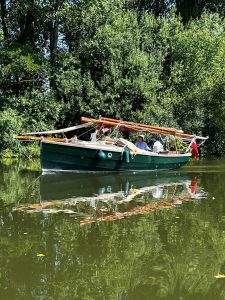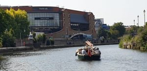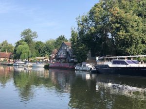 We arrived at  the very pretty Aylesford bridge near Maidstone around 14.30. This has an HW air-draft of 2.5m so it was definitely a mast-down job. We all anchored and helped each other to take our masts down in the middle of the river, which, by now, was quite narrow and starting to look and feel more like an inland river (although still tidal). The river then passed through Maidstone town centre and we shortly reached Allington Lock, where the tidal Medway finishes and it becomes a freshwater river.