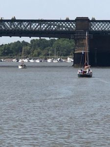Friday (15th July) There was a spring flood and gentle westerly to take us rapidly South. For the overnight stop, 4 Boats went into Burnham-On-Crouch and two into Bradwell. The next morning (Saturday) the Burnham boats explored the delightfully winding maze of creeks that connect the river Roach with the Thames at Havengore. By lunchtime we were waiting at the (lifting) Havengore bridge for the man to arrive for the first opening of the day (90 min before HW)