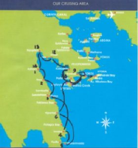 As Wendy has described in her detailed log below, we had good sailing, good weather, interesting places in the Argolic Gulf with good Greek food and good company with the flotilla sailors. Over the two weeks we were set challenges including to swap roles to come into the quayside, resulting in a few somewhat nervous partners taking the helm to back in for the first time, needless to say, all very successfully. One boat was obviously well prepared, as the regular crew were hijacked by Norma and Lorna who proved their skills!