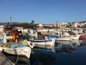 Tuesday’s wind again was stronger than predicted, so we reefed again for the 13NM sail to Leonidhian, sometimes known as Plaka (Greek for beach). Here we were somewhat challenged by the height of the harbour wall, so resorted to our dinghy rowing ashore to explore and eat at Marguerite’s, delicious sardines and she gave us apricots from her tree to take back to the boat.