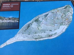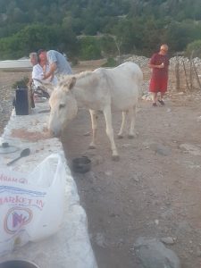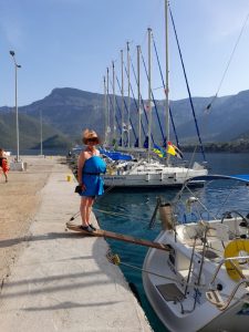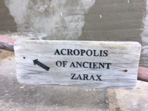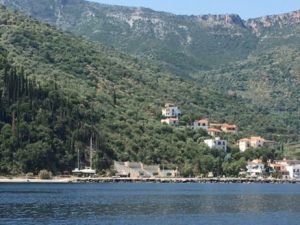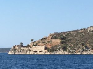 A longer trip on Wednesday of 25 NM, unfortunately the predicted 2-3 was optimistic and turned out to be a Beaufort 0, so a lot of noisy motoring to Leraka. Worth every mile of it. Leraka is a beautiful hamlet located in a fiord like inlet which provides a natural harbour. Here we moored bow-to the quay – great for swimming in the crystal-clear water, but keeping clear of the resident turtle with his powerful flippers. A delightful location for an evening stroll along the side of the fiord and spotting the route up to the ruins of Ancient Zarax, once a great fortified city.
