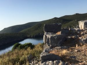 The next morning saw Bob and I up early to clamber up to the ruins in the cool of the early morning, the pathway somewhat overgrown, but marked by red painted dots on the rocks. Fragrant late spring flowers and herbs as well as bird song accompanied us. We were rewarded by the extensive views over the surrounding countryside and the entrance to the well protected natural harbour.