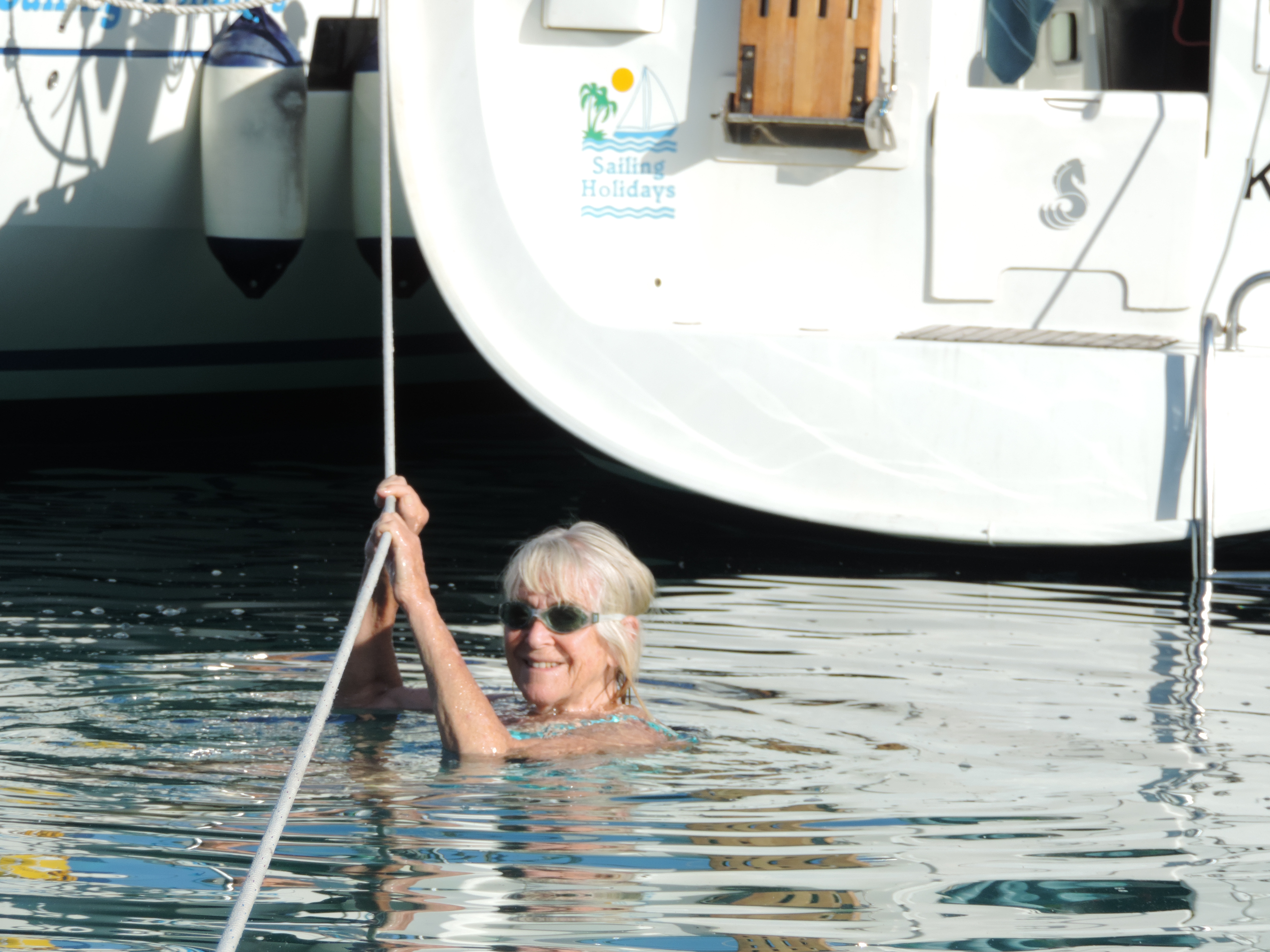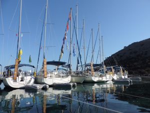 Friday, we headed north again, 21NM to Kiparissi. This was a frustrating hot day with little and fickle wind, of attempts to sail, but reverting to engine for much of the way. Crews were challenged to swap roles to come into the quayside, resulting in a few somewhat nervous partners taking the helm to back in for the first time, needless to say all very successfully. One boat was obviously well prepared and the regular crew were hijacked by Norma and Lorna who proved their skills. Another ice breaker punch party that evening, although not required as everyone seemed to be getting along very well. Another glorious setting for swimming and dolphin spotting.