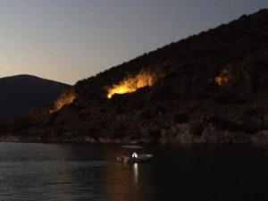 Our next port of call was Khoiladhia, which was to prove our favourite anchorage of this trip. We anchored beneath Megolithic caves, where the oldest remains of human life in Greece had been discovered, and which were flood lit at night.